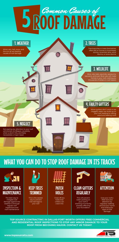 A storm can be a homeowner’s worst nightmare. When hail starts falling, you can only stand by and watch as Mother Nature takes her toll. While you feel blessed as the hail bounces off your roof, protecting you and all you own, when the banging stops, you worry about the damage caused. Mother Nature is just one common cause of roof damage. Top Source Contracting is Dallas-Fort Worth’s Top Rated Local® roofing contractors who offers both residential roof repair and commercial roof repair, as well as roof replacements when your home or business is damaged. If you suspect roof damage after a storm hits or at any other time, give us a call for a free roofing inspection today!